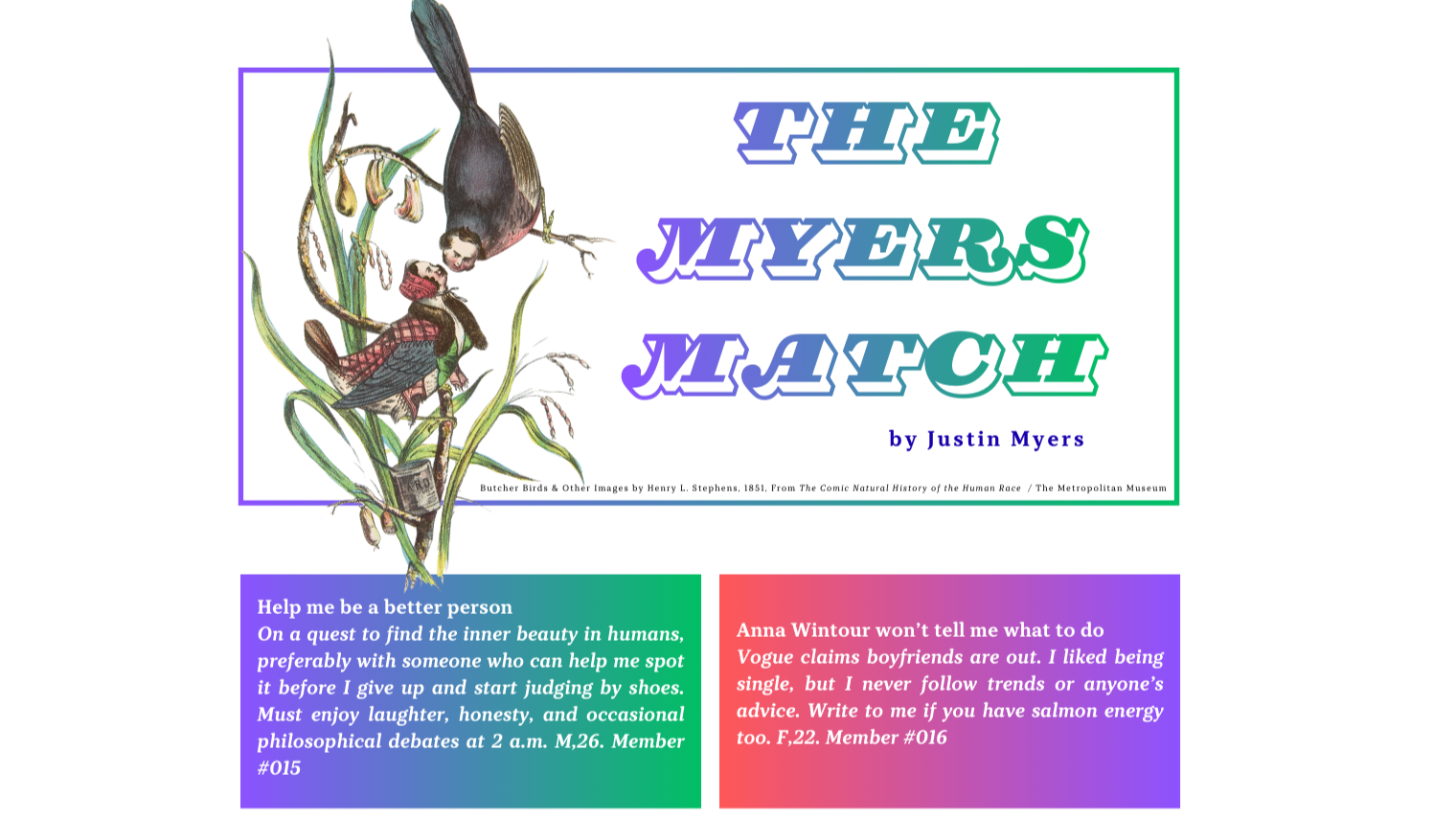 Want to see if fate has a sense of humour? Submit your own personal ad to The Lonely Hearts Club for a chance to be paired by Justin Myers in an upcoming issue of “The Myers Match”.